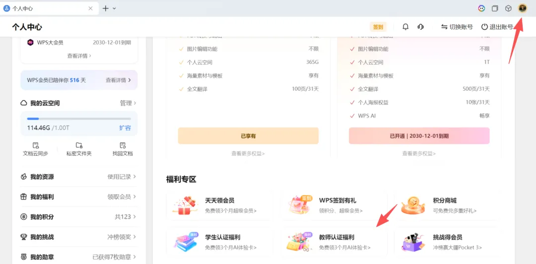 登录WPS后,点右上角头像进入到“个人中心”,然后选择“教师认证福利”。