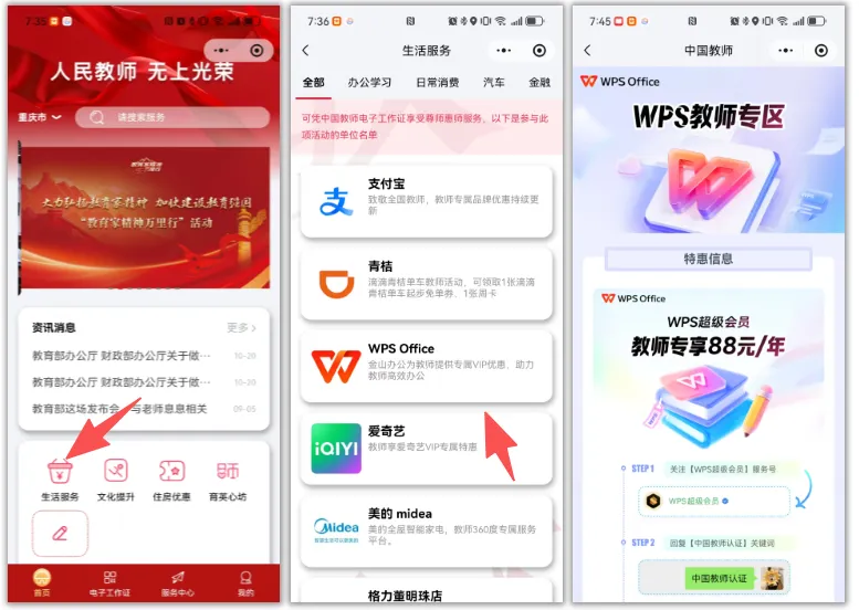 不过,这里介绍的是WPS超级会员,教师专享88元/年,同等级别的会员要137元/年,能节约几十元。但在“中国教师”小程序里找不到入口,只能在WPS软件界面去认证。
