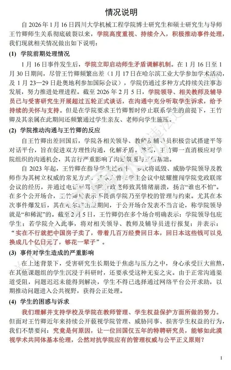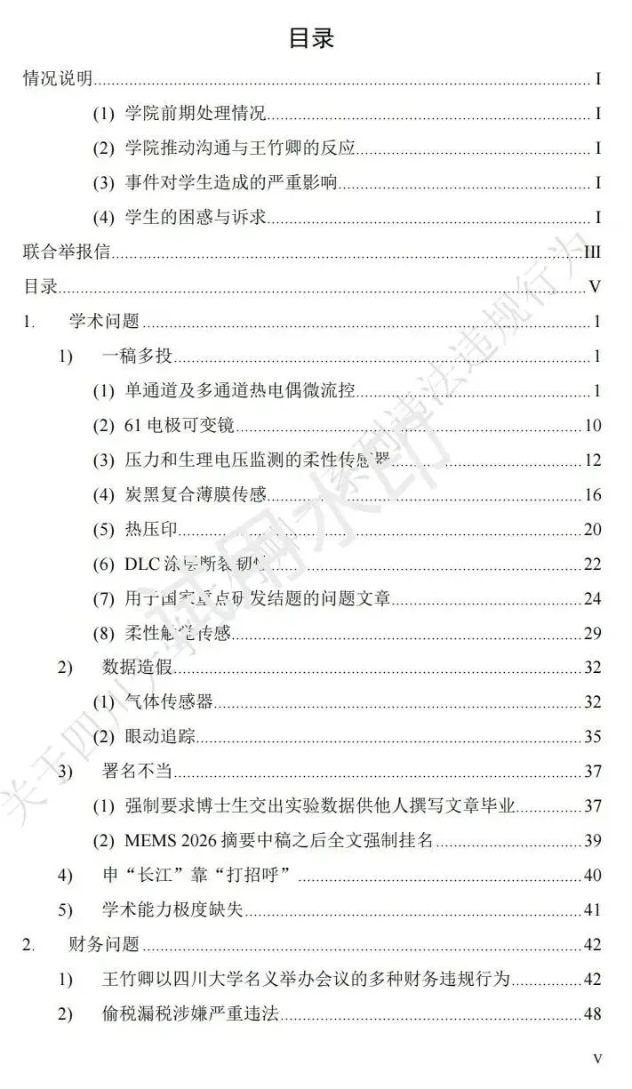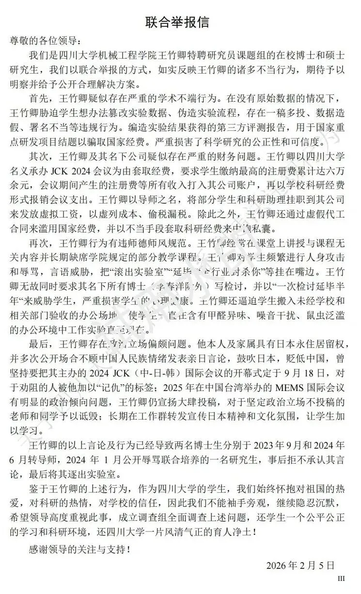 近日,四川大学某课题组多名在读硕博研究生联合举报其教师王竹卿,并制作了长达83页的PDF材料作为依据,举报材料在网络热传,指控内容涉及学术不端、侵占经费、师德失范等。