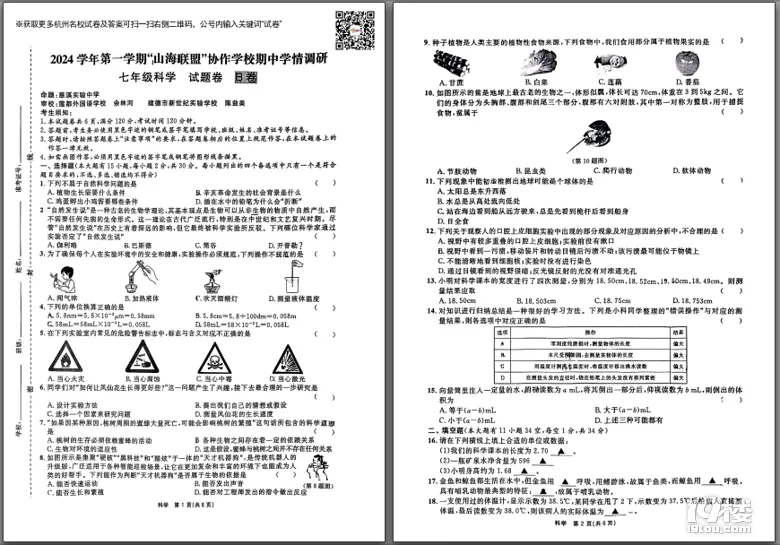 今天为大家准备的是家长上传的2024-2025学年浙江省山海联盟七上期中测试科学试题B卷,获取试卷完整电子版pdf免费下载及参考答案分析请点击文中的小程序!