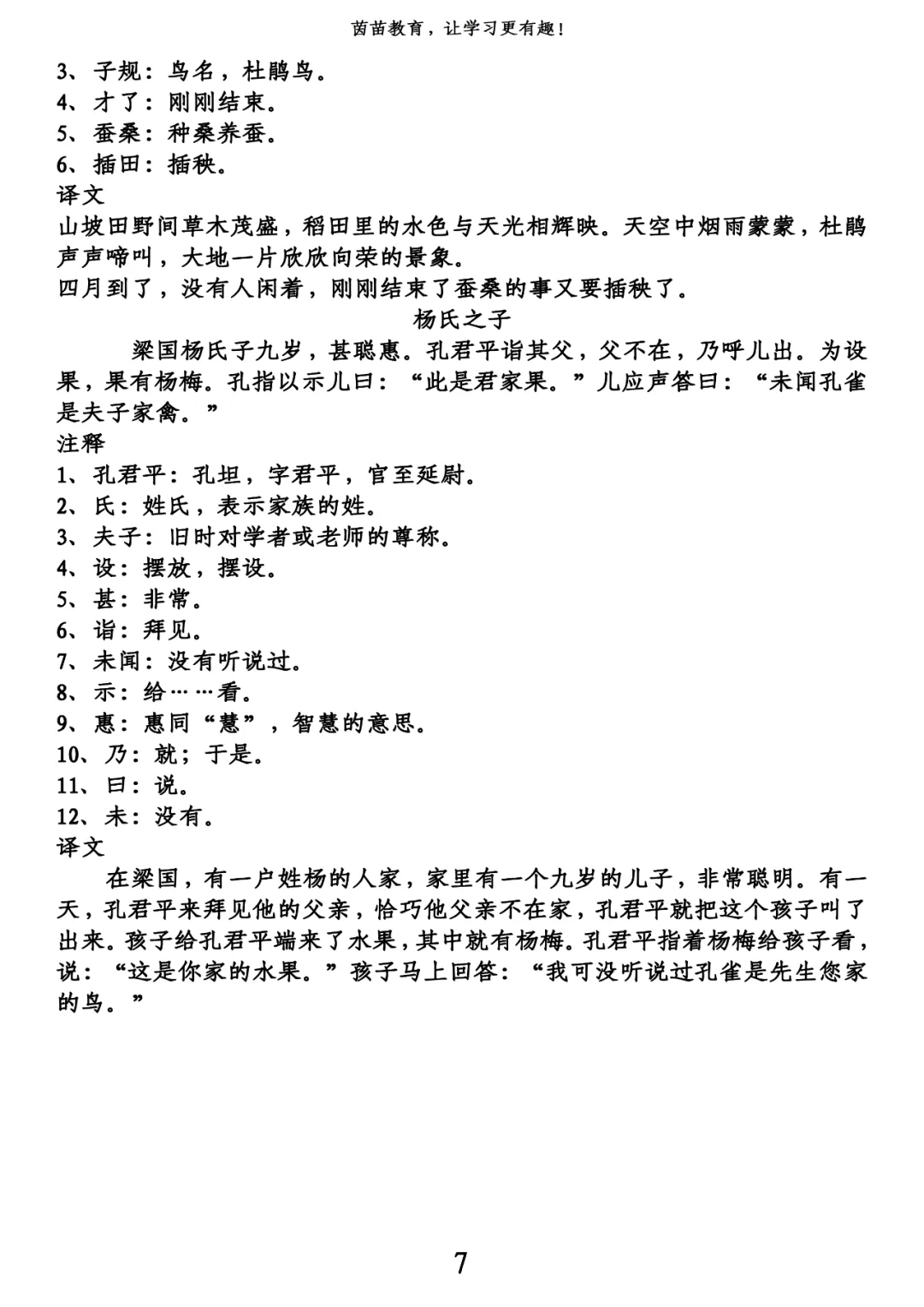 梁国杨氏子九岁,甚聪惠。孔君平诣其父,父不在,乃呼儿出。为设果,果有杨梅。孔指以示儿曰:“此是君家果。”儿应声答曰:“未闻孔雀是夫子家禽。”