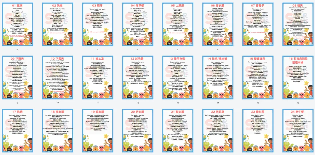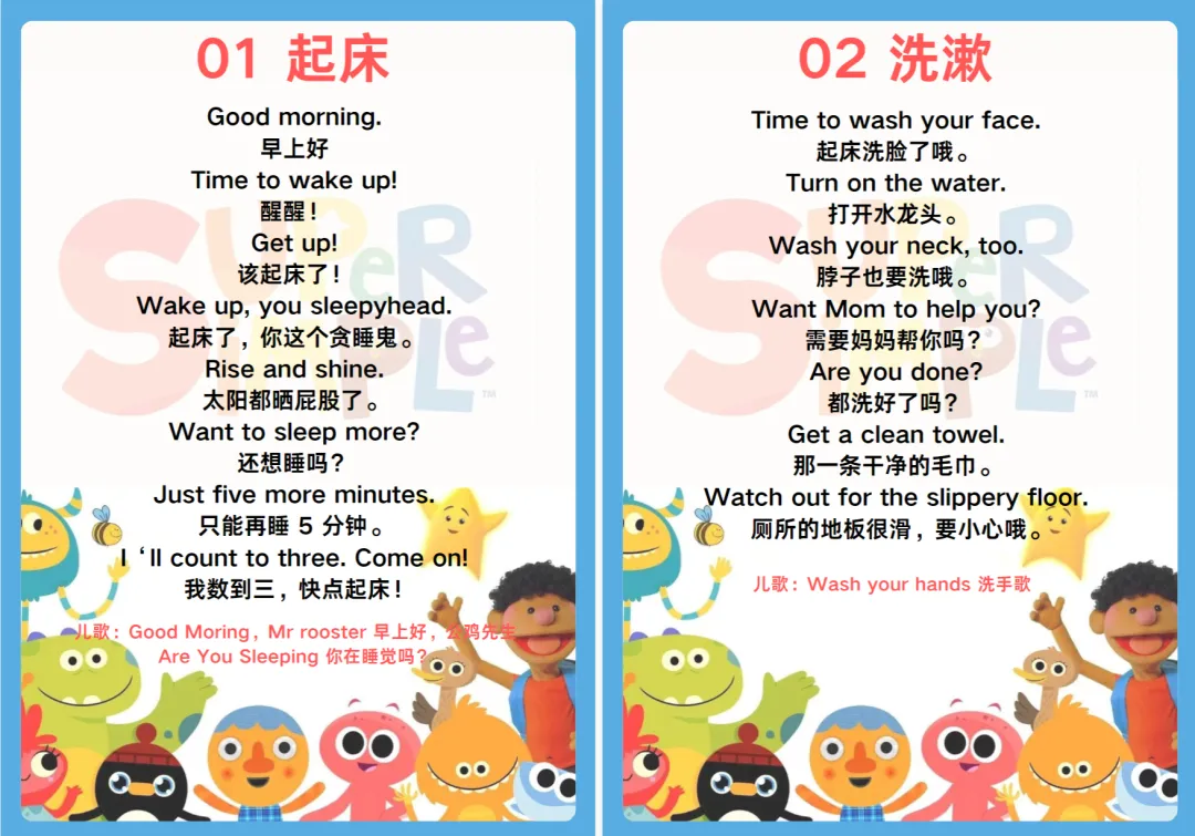 亲子口语启蒙,不用记,不用背!把这份资料都打印出来贴在对应的场景,每天和孩子一起练一练,日复一日,就都会啦!再配上朗朗上口的SSS儿歌效果更好哦!