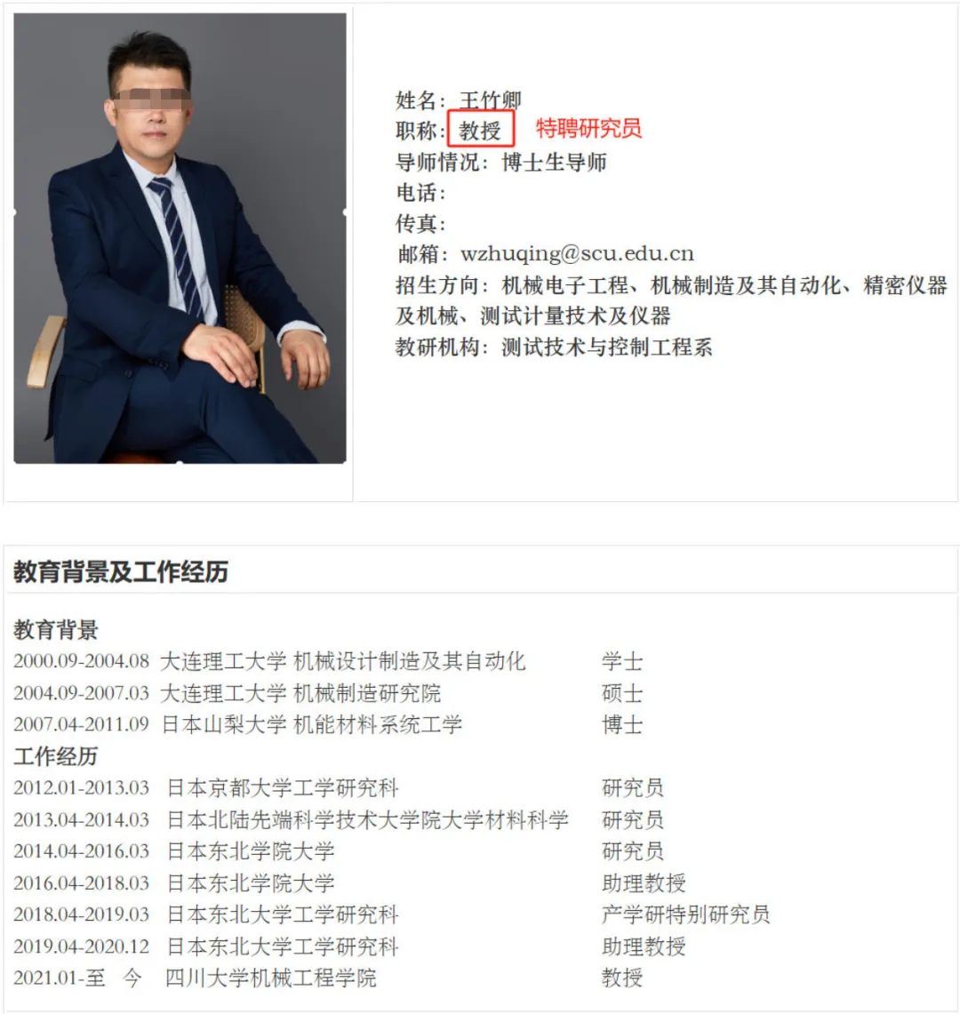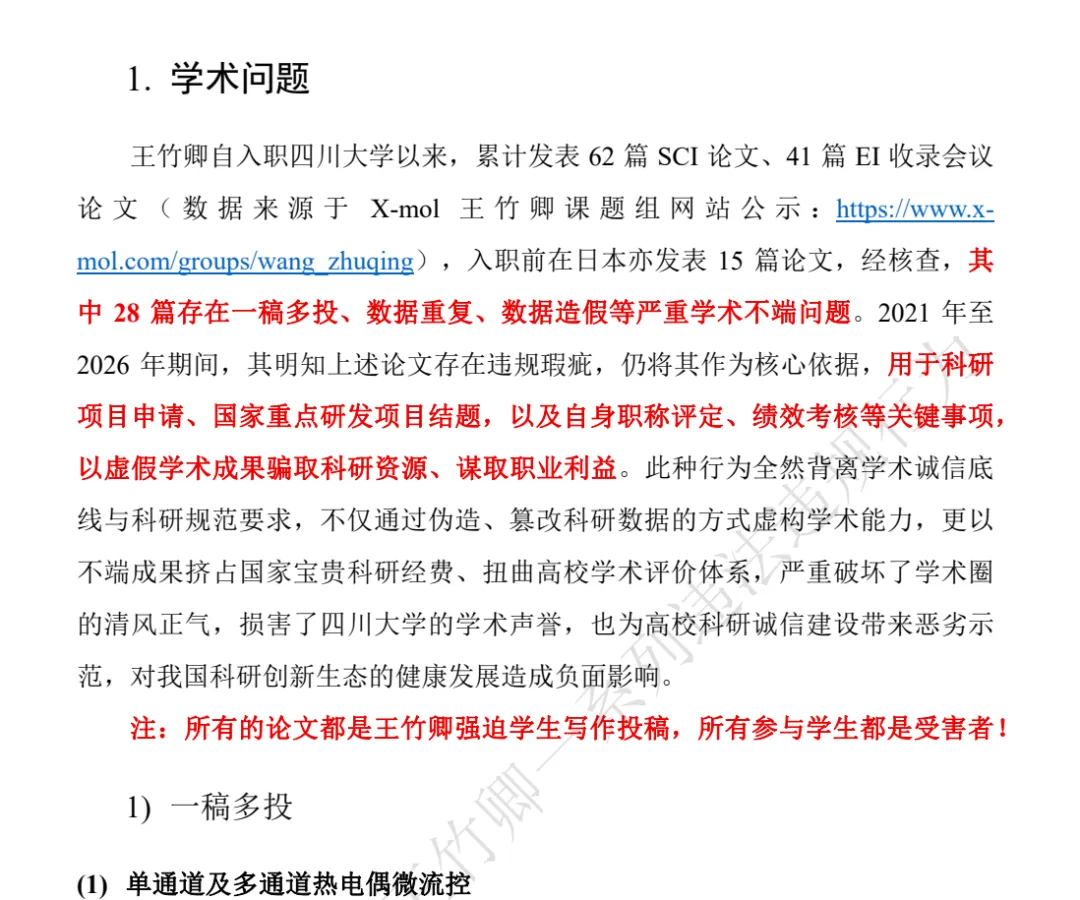 近日,四川大学机械工程学院博导王竹卿被课题组多名硕博生联合实名举报,举报内容涉及学术不端、侵占科研经费、师德失范等多个问题。