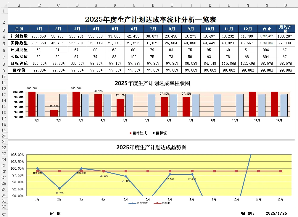 目标达成率 采用加权计算方式:=(实际数量/计划数量)/2 + (实际批量/计划批量)/2既考虑数量完成情况,也兼顾生产批次的执行效果,更反映实际达成水平。