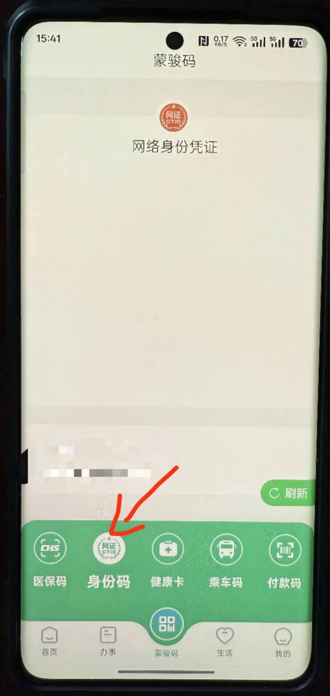 进入“蒙速办”App 后,点开下方蒙骏码,选择身份码进行人脸认证,即可生成网络身份凭证二维码。