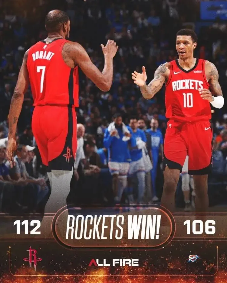 赛后火箭官方发布本场赢球海报,封面为杜兰特和小贾巴里·史密斯的击掌瞬间。