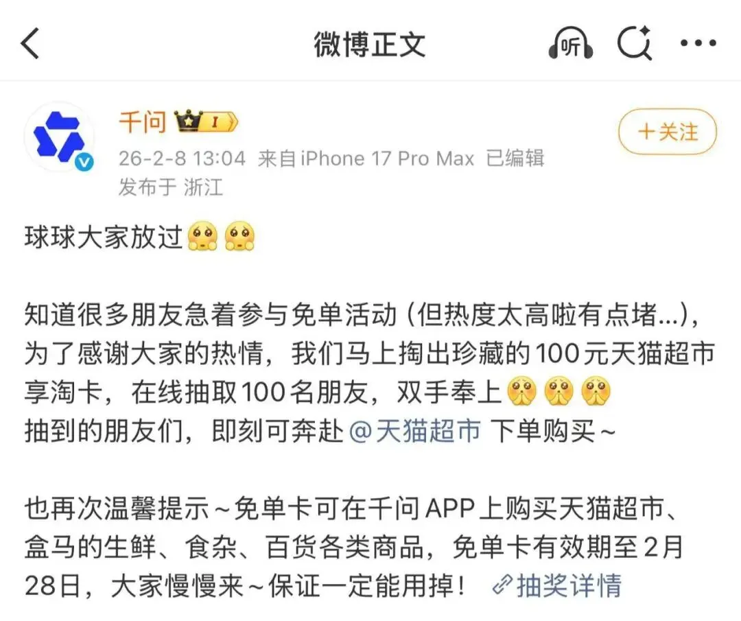 2月8日下午,千问发文:“球球大家放过”,知道很多朋友急着参与免单活动,但热度太高有点堵。同时再次提醒大家,免单卡有效期至2月28日,“大家慢慢来,保证一定能用掉!”