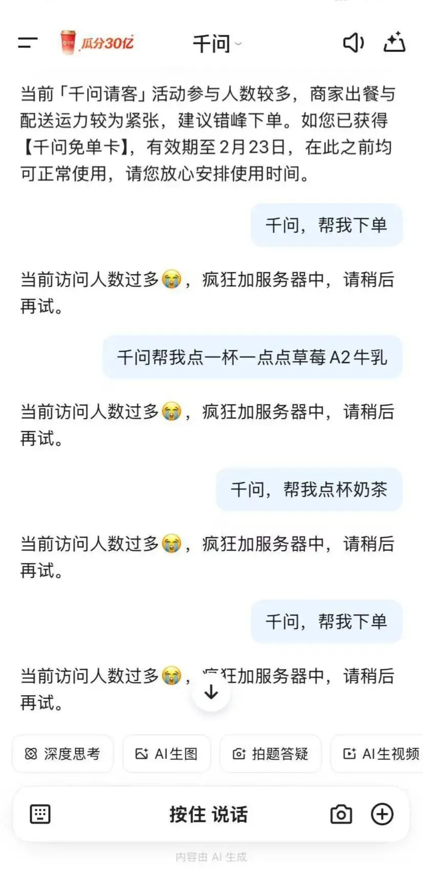 上线当天,就有不少用户反馈,活动出现服务器卡顿问题。一位武汉用户介绍,当晚,他尝试用千问下单奶茶,多次输入口令后系统均提示“当前访问人数过多,疯狂加服务器中,请稍后再试”。千问官方也在活动首日下午发帖称“今天累垮了,球球大家明天再来。”