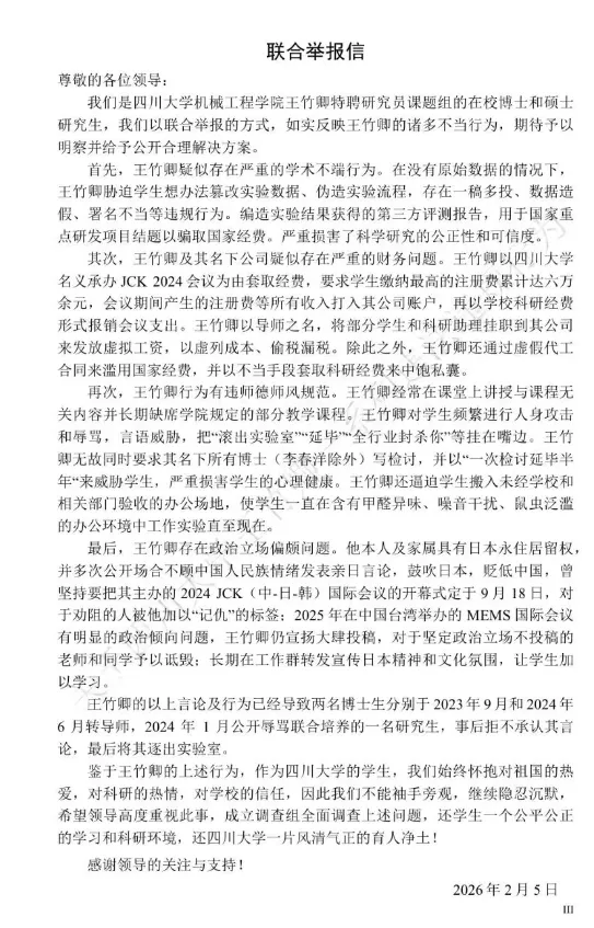 公开信息显示,王竹卿为四川大学教授、博导。近日,四川大学某课题组多名在读硕博研究生联合举报王竹卿,并制作了长达83页的PDF材料作为依据,指控内容涉及学术不端、侵占经费、师德失范等。