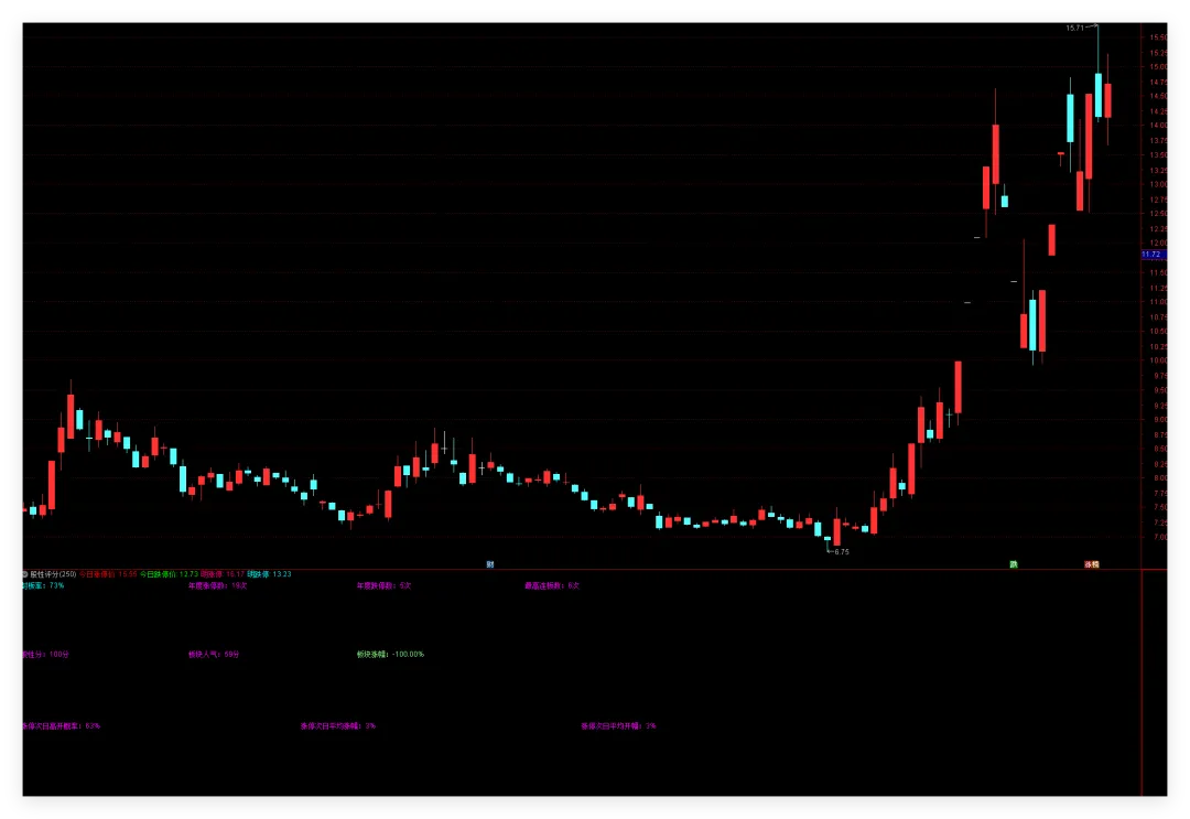条件 :当你准备打板一只股票时,看一眼左上角的**【封板率】和 【涨停次日高开概率】**。操作 :如果封板率 > 80% 且 次日高开概率 > 60%:说明主力资金实力强,第二天大概率有肉,可猛干。 如果封板率 < 50%:说明这票经常炸板,大家叫它“烂板王”,管住手,别去送人头。