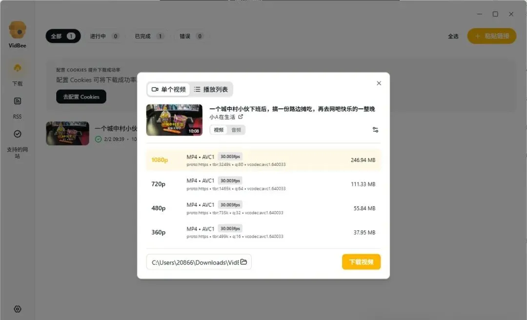 直接复制粘贴链接到这里下载,软件会自动解析视频,列出可用的分辨率如 1080p、4K
