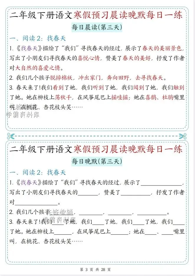 文末免费下载|(完整版)26春二年级语文下册寒假预习晨读晚默每日一练