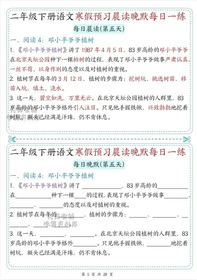 ✅️「 二年级(下)语文寒假预习晨读晚默每日一练.pdf」链接:https://pan.quark.cn/s/94508baa5091