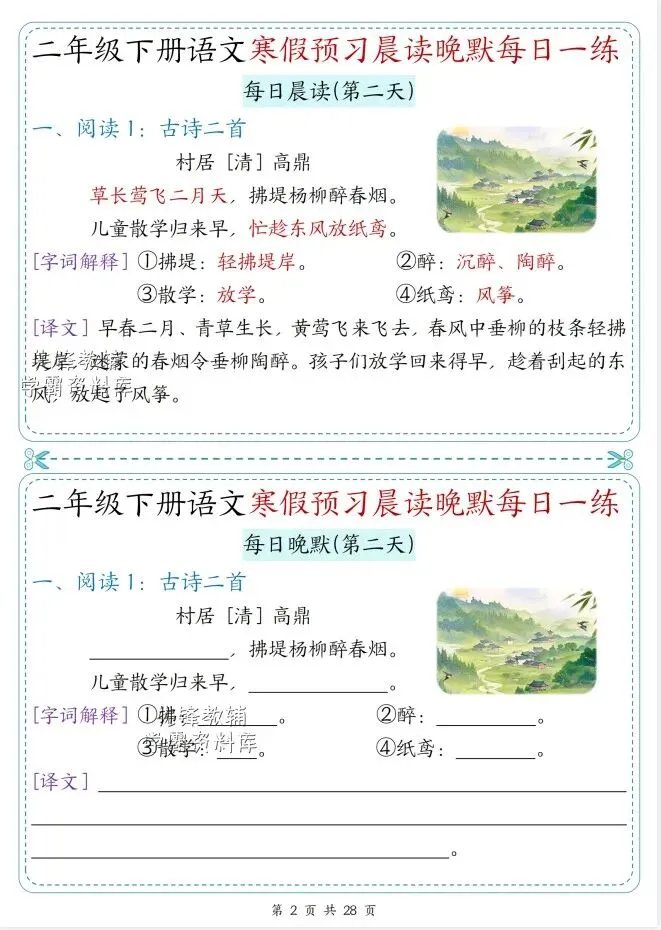 文末免费下载|(完整版)26春二年级语文下册寒假预习晨读晚默每日一练