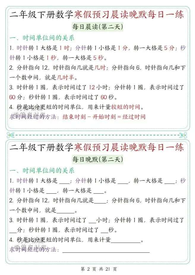 文末免费下载|(完整版)26春二年级数学下册寒假预习晨读晚默每日一练