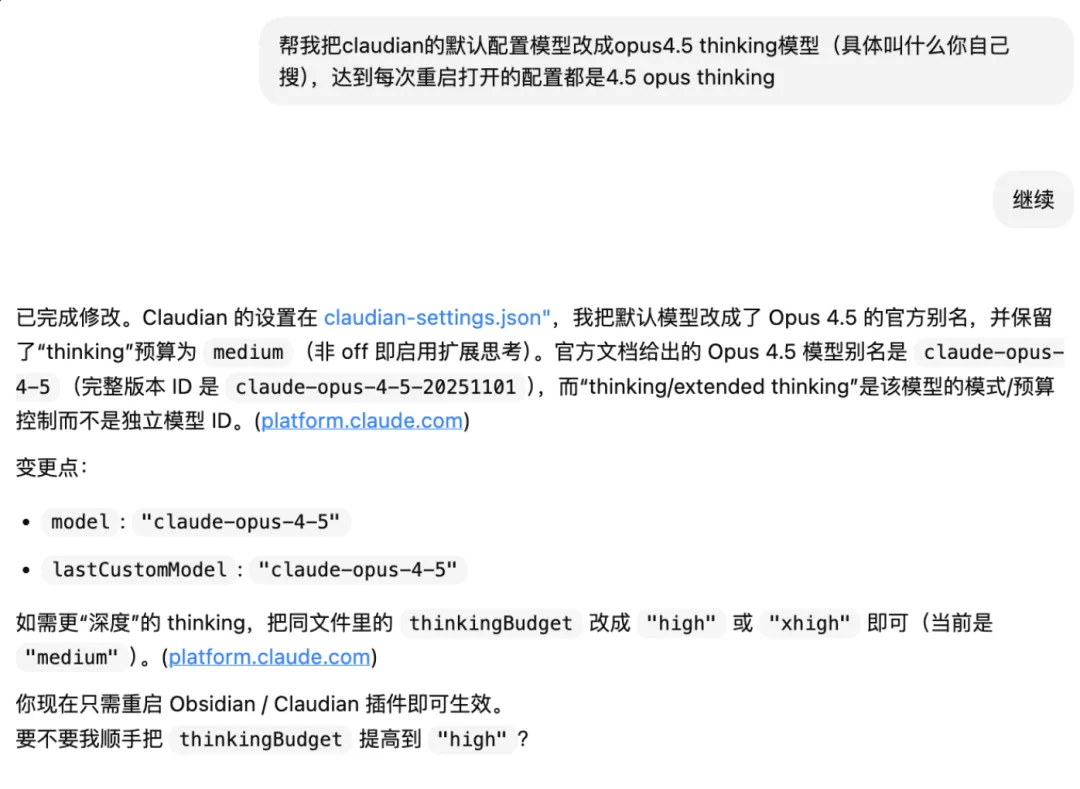 于是我点击了允许,让 Codex 根据报告内容修改,大概1分钟不到的时间,codex 报告已经修改好了,我重启 obsidian 一看,果然准确地把模型改成了 4.5 thinking 的版本。