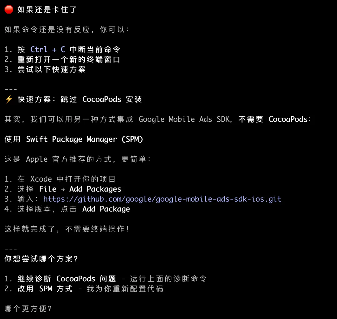 它建议我使用SPM的方式安装CoCoaPods,又失败了