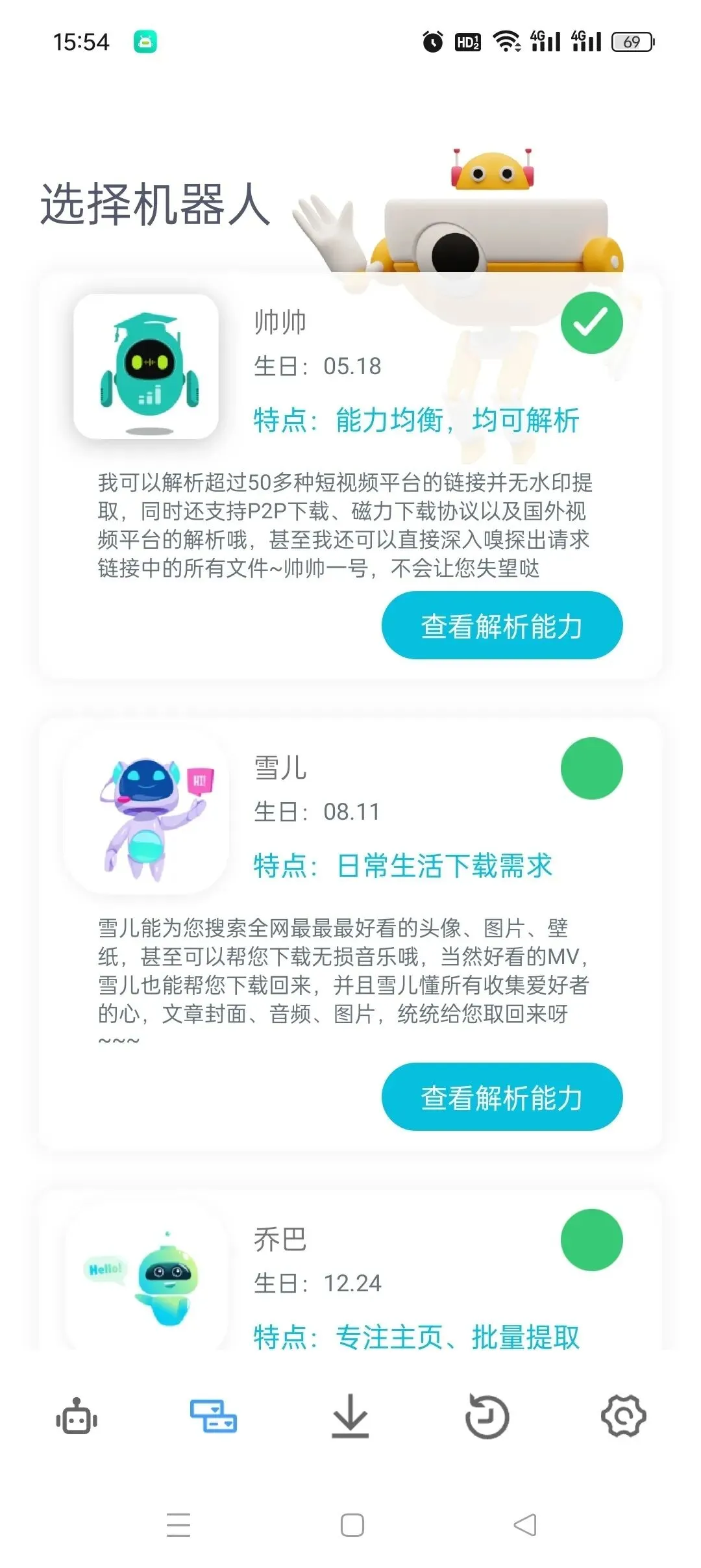 这款APP最酷的地方在于,它内置了五位各怀绝技的智能机器人,仿佛你的专属下载助手团队: