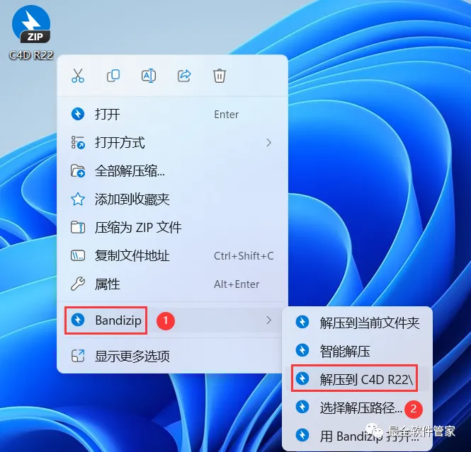 1、下载C4D R22软件安装包到电脑上,右键选择【解压到C4D R22\】