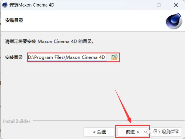 5、软件默认安装在C盘,可自定义更改软件安装位置,这里小编选择安装在D盘;点击【前进】