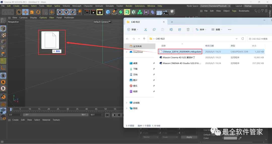 19、打开C4D R22文件夹,将【Chinese…】文件拖到软件内