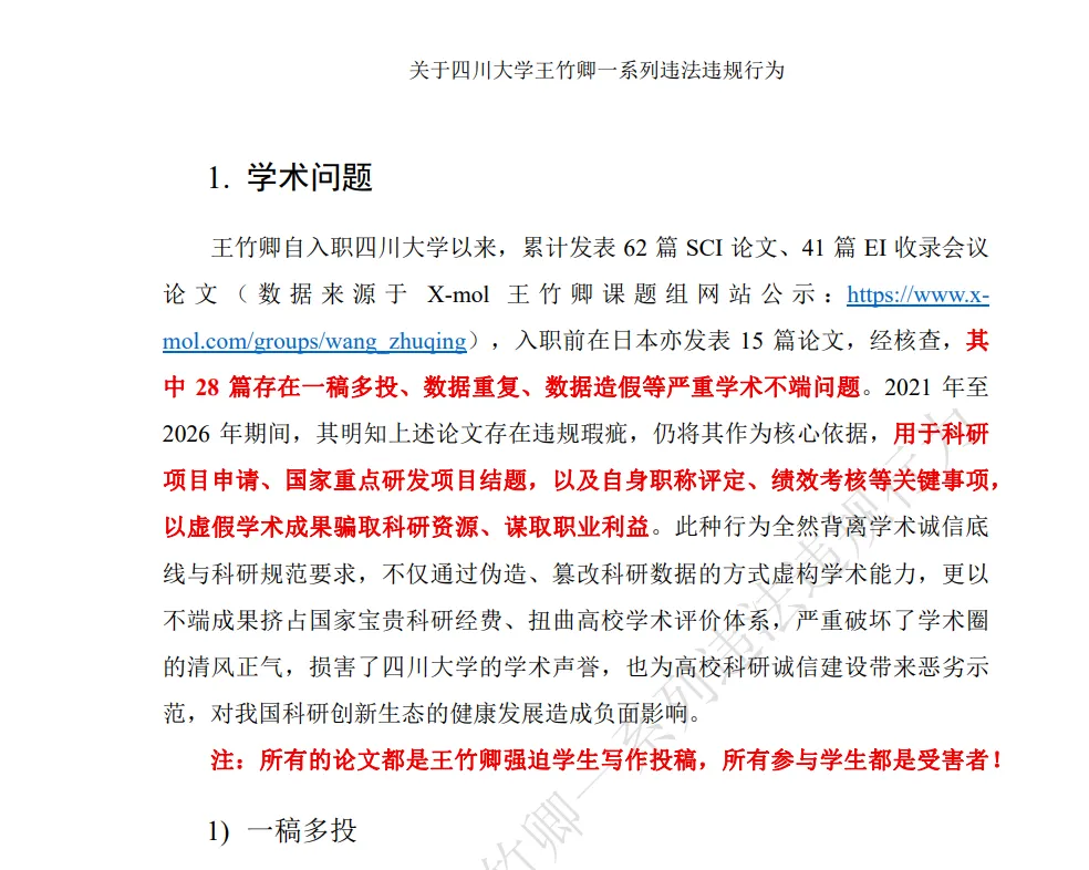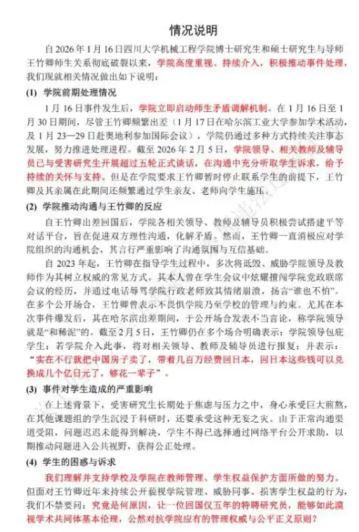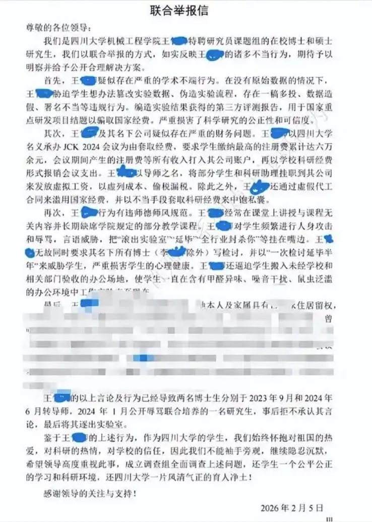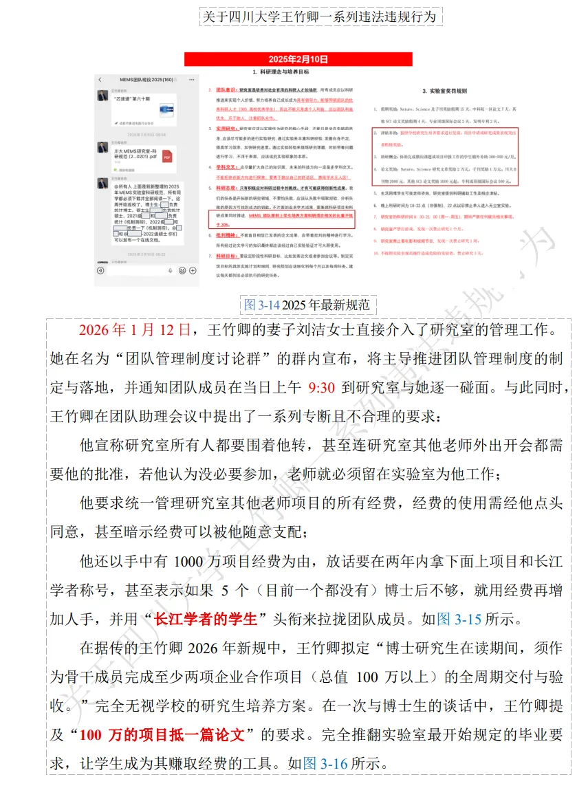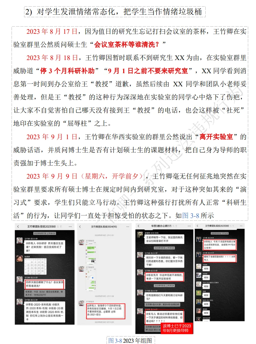 四川大学机械工程学院特聘研究员、博士生导师王竹卿,被课题组30余名在读硕博生,联名递上83页实名举报材料!