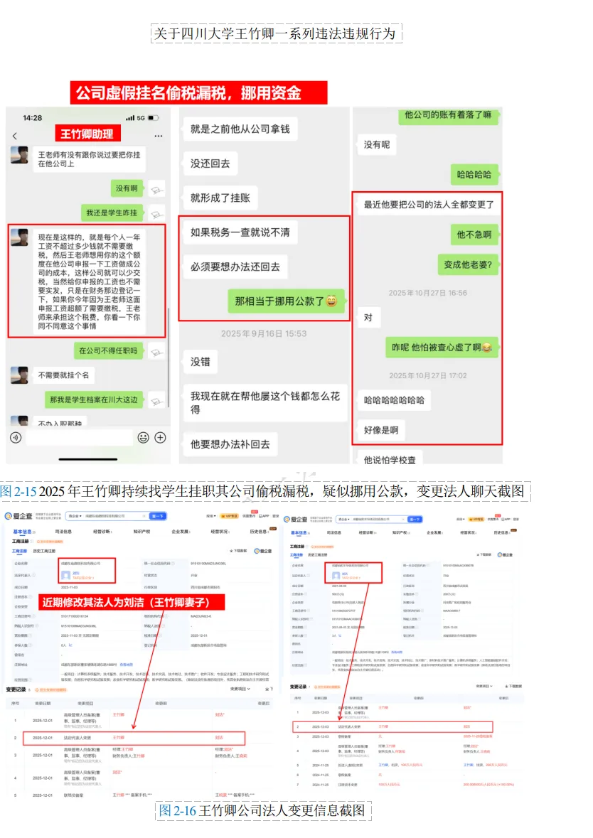 2023年到 2025年这两年他更变本加厉,让多名学生、科研助理在自己的公司虚假挂名。