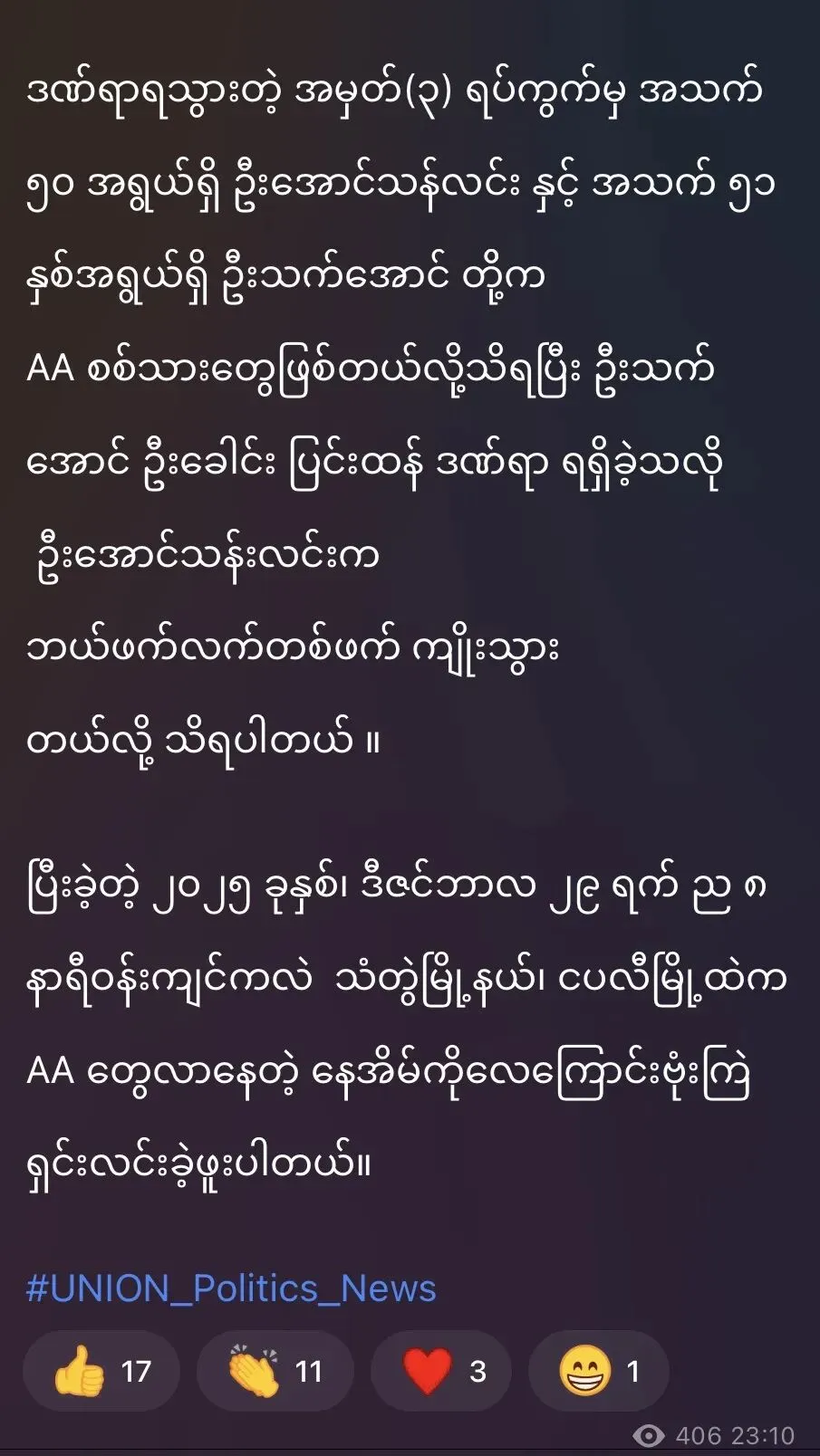 其中,U Thet Aung头部受到严重伤害,UAung Than Lin则伤及一只手臂。两人均为AA成员。