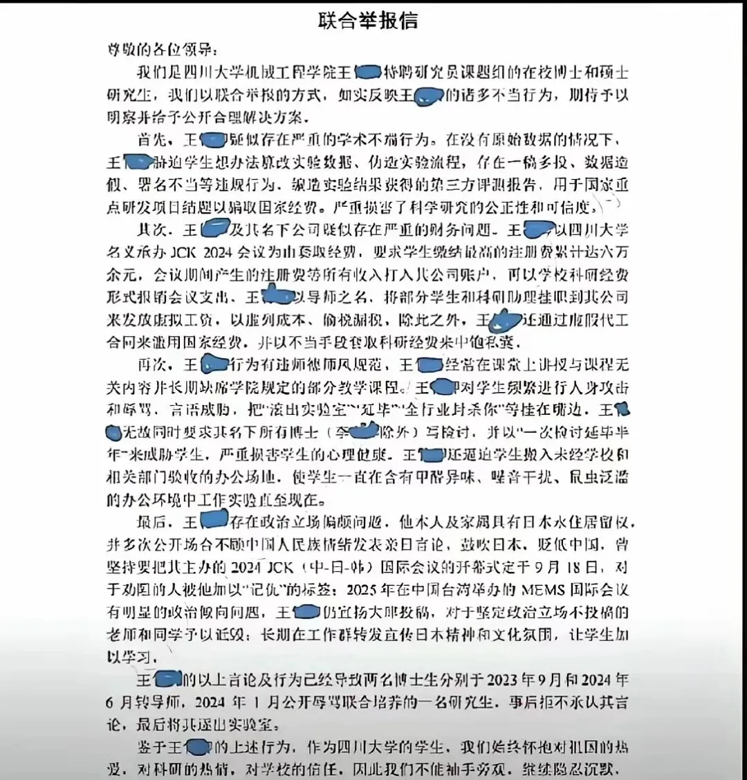 2026年1月16日,四川大学机械工程学院的一间实验室内,几名硕博研究生做出了一个艰难的决定。他们开始整理材料,准备举报自己的导师王竹卿。