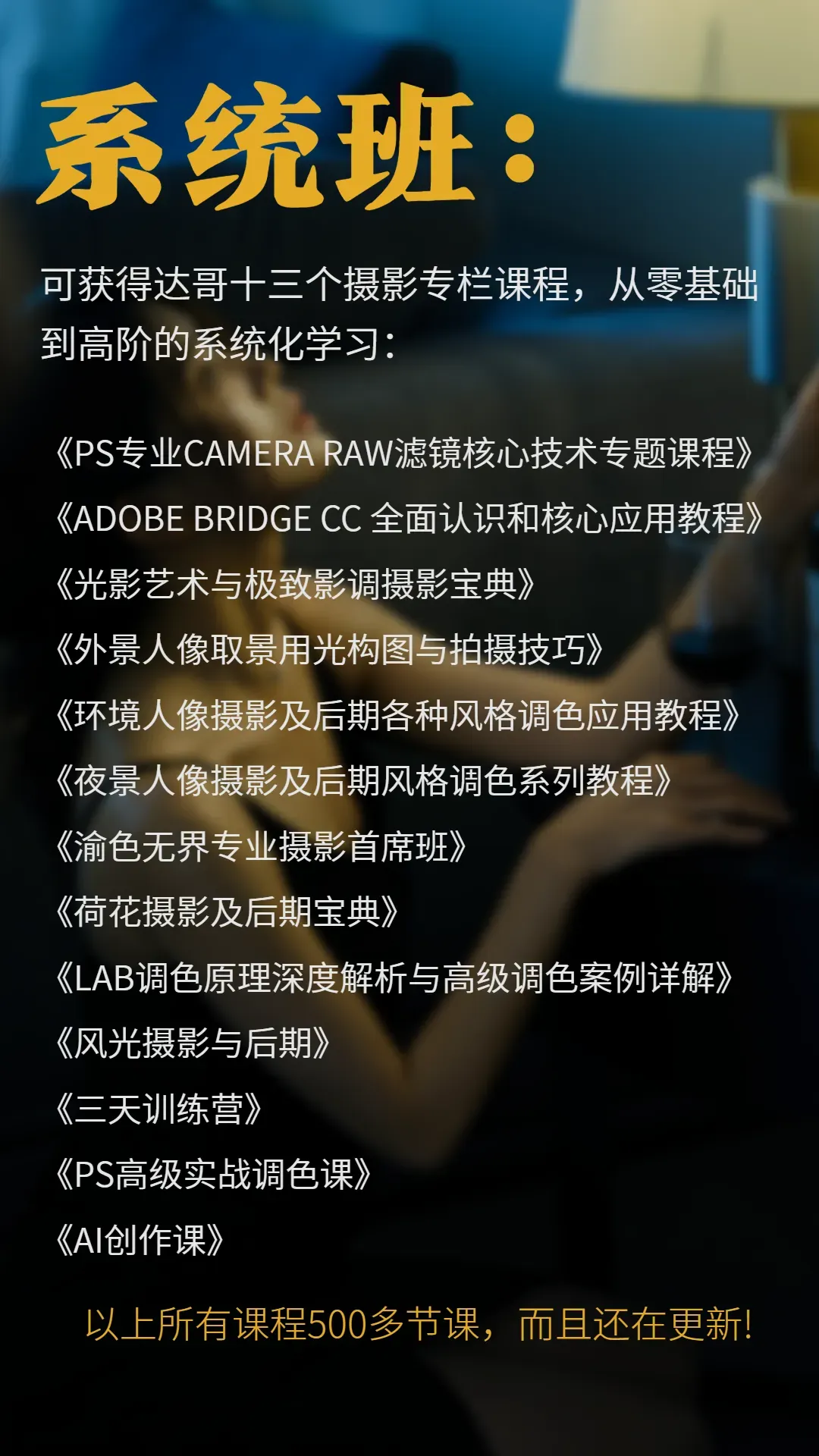 1、可以学习近50个专栏,几千节的系统课程,包含未来更新的课程,从入门到精通、从前期拍摄到后期PS、从照片拍摄到视频拍摄、从照片后期到视频后期2、弟子班,包含精英班、全能班、训练营等3、弟子班享受终身学习、终身服务4、弟子班学员购买台式电脑主机、显示器、笔记本电脑、相机镜头、灯光、收费软件,均享受相应优惠5、弟子班学员,终身享受课程软件、插件更新服务6、弟子班,享受每年达哥线下班报名费用优惠7、其他福利