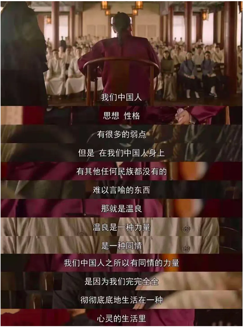 就像《觉醒年代》中,辜鸿铭老先生所说的:我们中国人骨子里有一种其他民族都没有的温良。