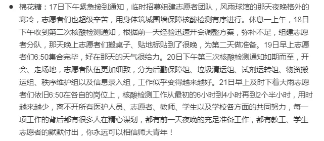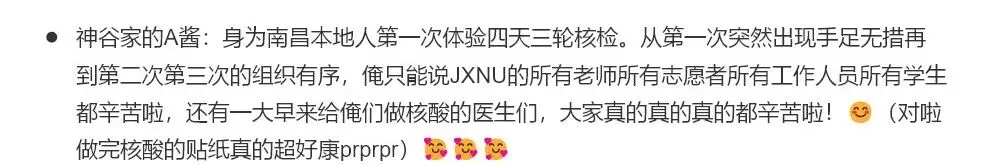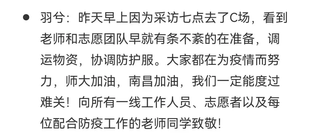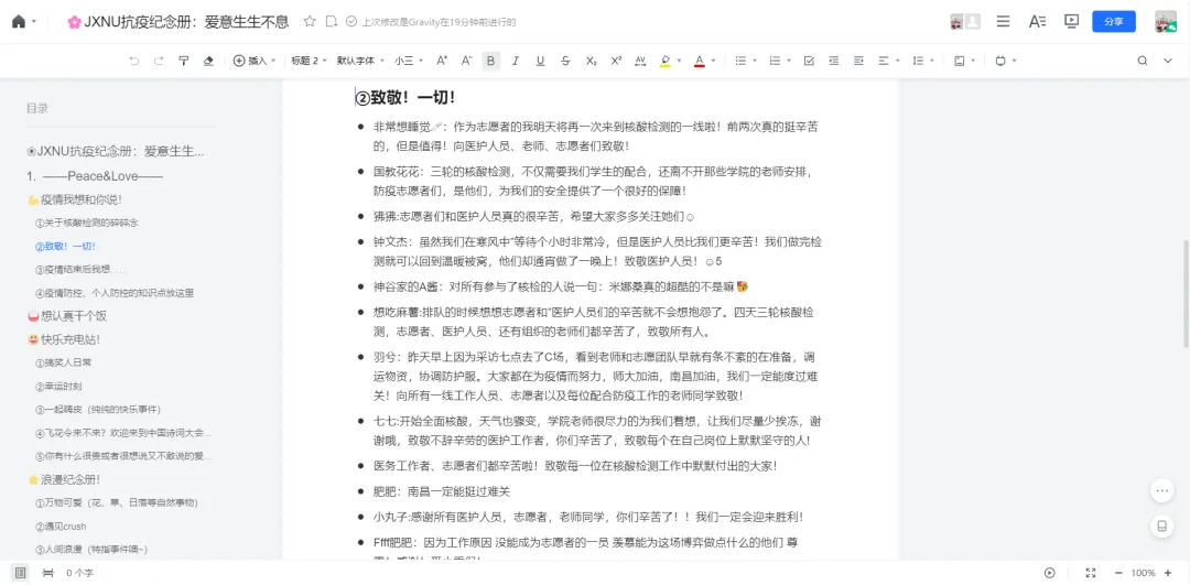 “希望自己的所做的事情能影响更多的人,给更多人以力量和思考。这次疫情无疑是一个坎坷,但幸运的是技术成就了炽热的情义,共享文档的出现让每一个人都可以同时看到、同时书写自己的所思所想,无形而温暖的jxnu抗疫纪念手册就这样不谋而合的出现了。”江西师范大学团委新媒体运营中心小伙伴琪琪说道。