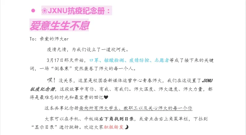 江西师范大学团委新媒体运营中心的几位伙伴开始了《JXNU抗疫纪念册》在线文档的制作,这也是青春师大第一次以共同协作的方式,让每一位同学都能够成为发声的人和记录者。