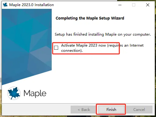 第十三步:取消勾选【Activate Maple 2023……】,然后点【Finish】。
