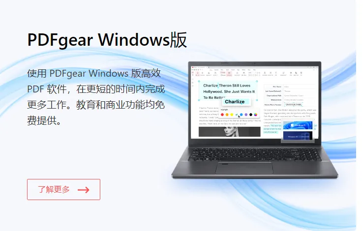 使用 PDFgear Windows 版高效 PDF 软件,在更短的时间内完成更多工作。教育和商业功能均免费提供。