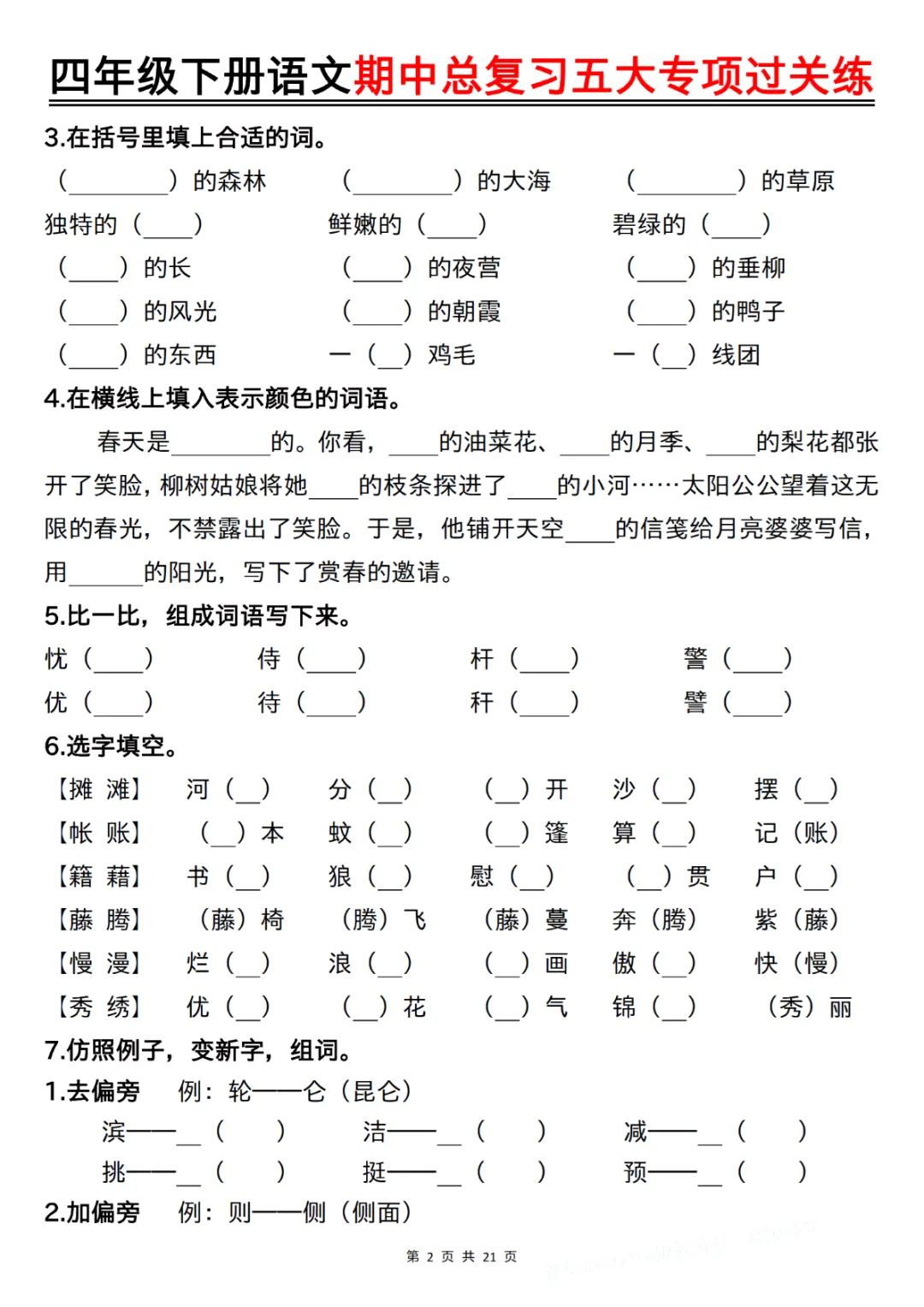 【免费下载】四年级(下)语文 期中总复习五大专项过关练,PDF电子版,可打印