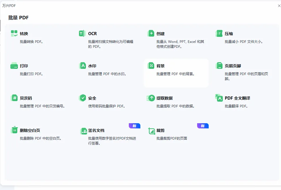 批量功能非常全面包括转换、OCR、创建、压缩、打印、水印、背景、页眉页脚、提取、全文翻译等等。