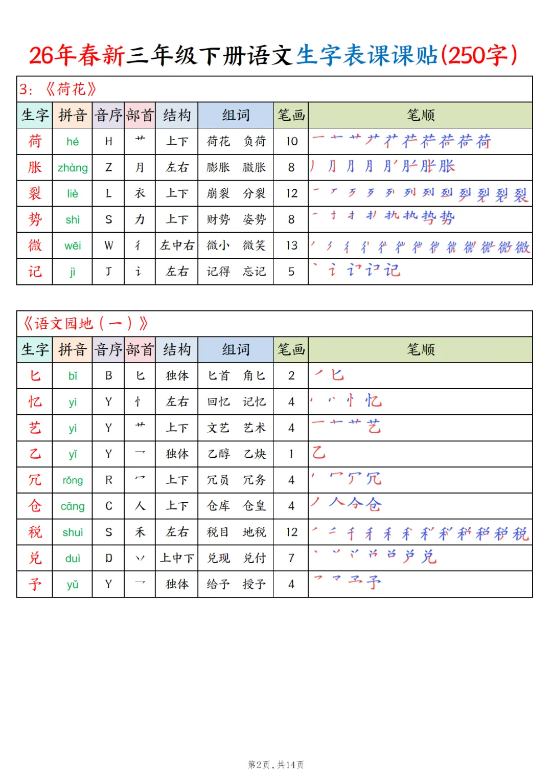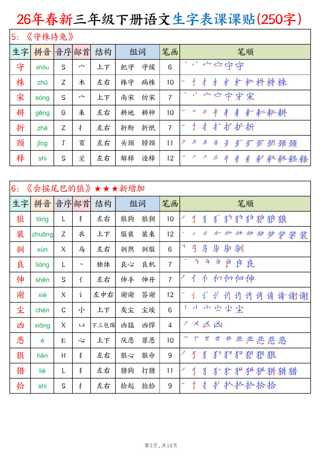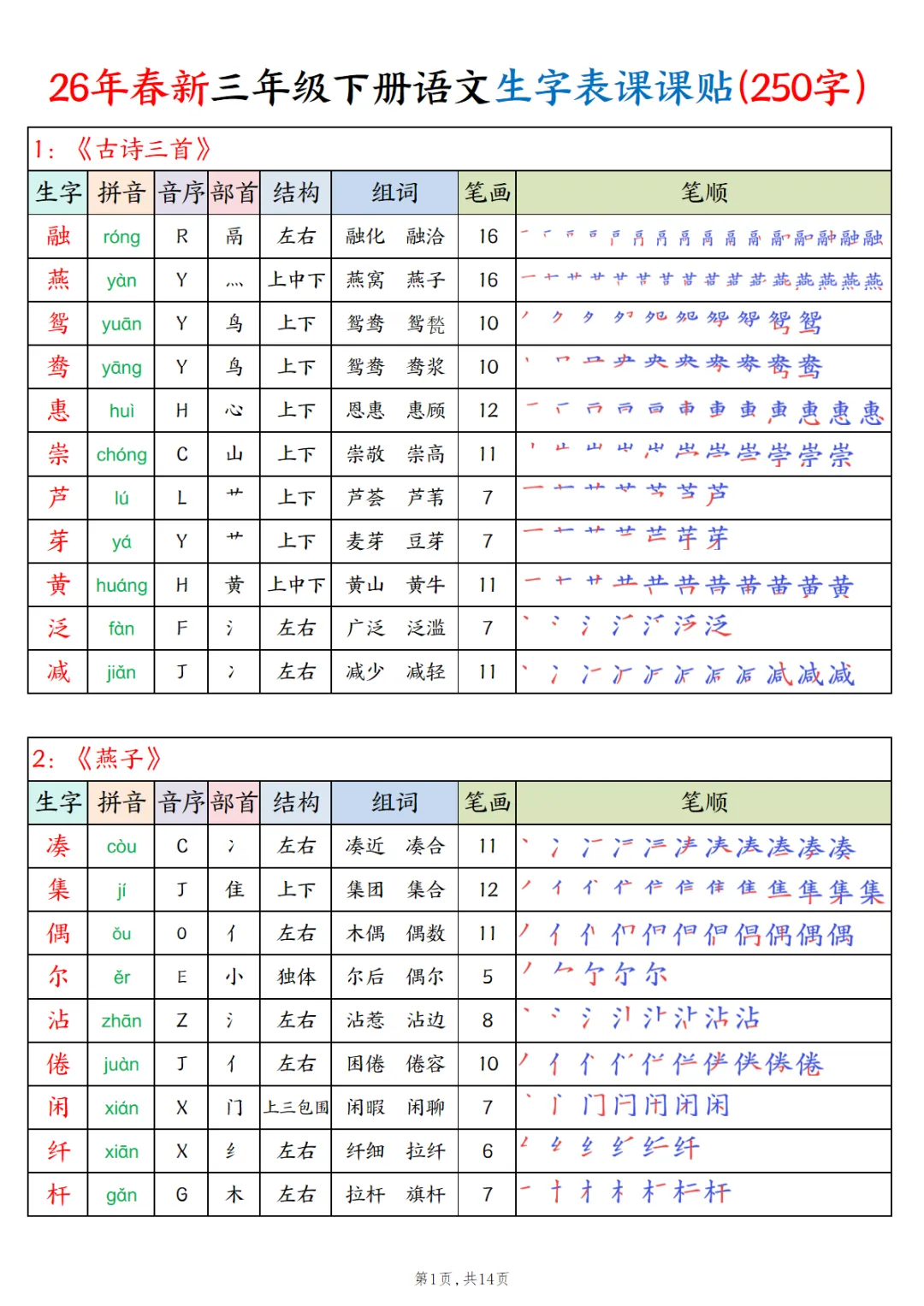 【免费下载】26年春新三下语文生字表课课贴(250字)14页