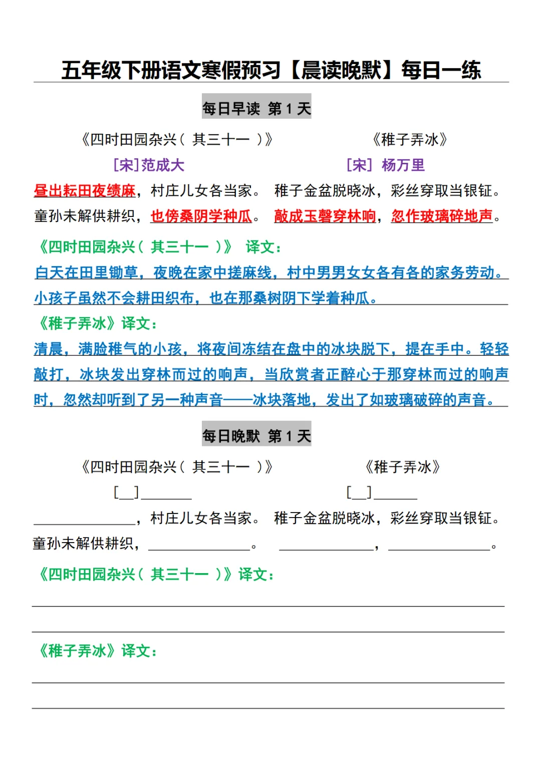 【免费下载】五年级(下)语文寒假预习【晨读晚默】每日一练