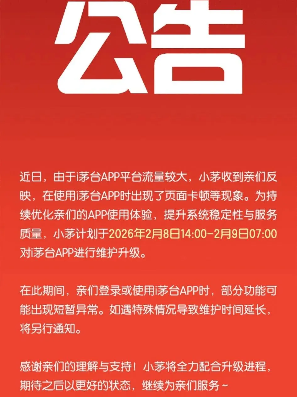 茅友们注意!i茅台APP发布维护升级公告啦!平台计划于2026年2月8日14:00-2月9日07:00进行系统维护升级。