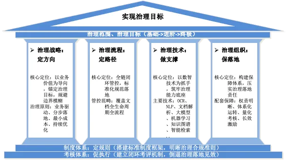 3)治理原则:业务驱动、分步落地、最小成本、持续优化,优先治理核心业务域的高价值文档,再逐步拓展至全业务,避免“一刀切”式的全面治理。