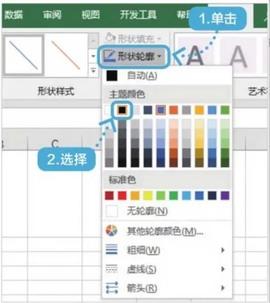 04单击【绘图工具】→【格式】→【形状样式】组→【形状轮廓】按钮的下拉按钮,在弹出的下拉列表中选择“黑色”。