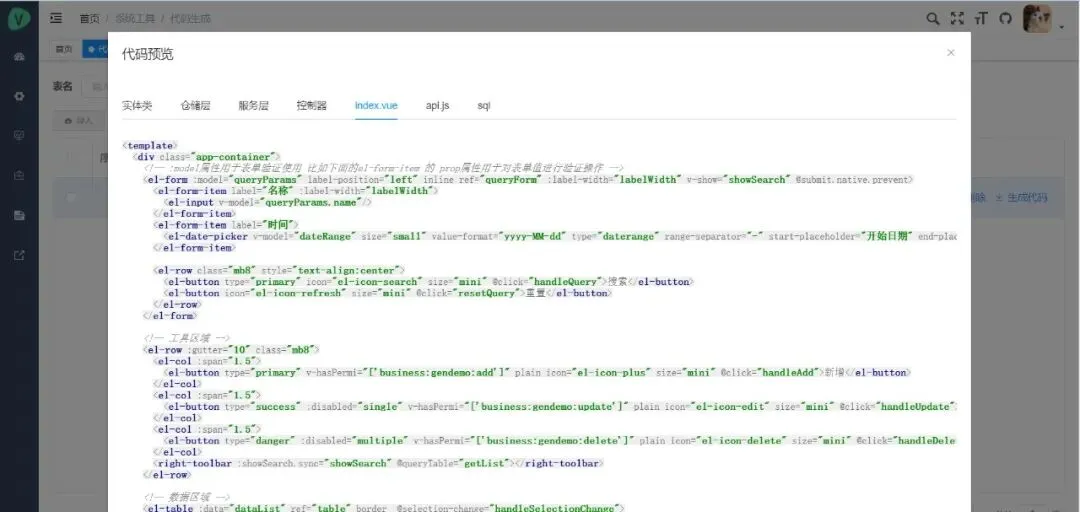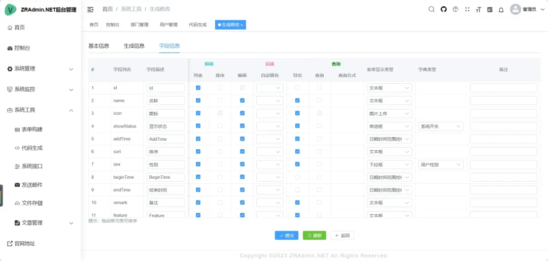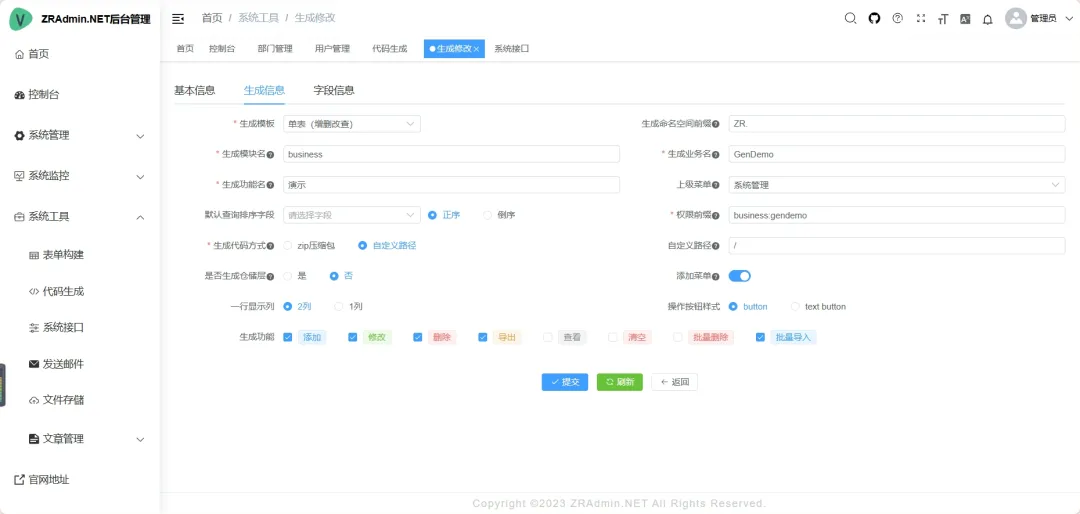 • 代码生成:一键生成前后端代码(.cs、.vue、.js、.sql、Uniapp等),支持自定义控件配置与下载。