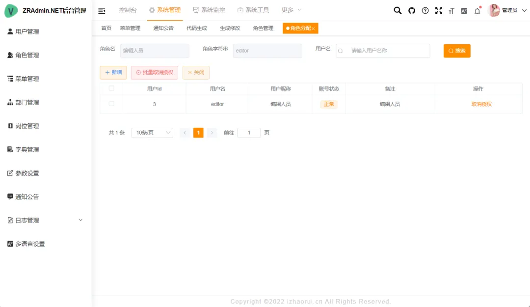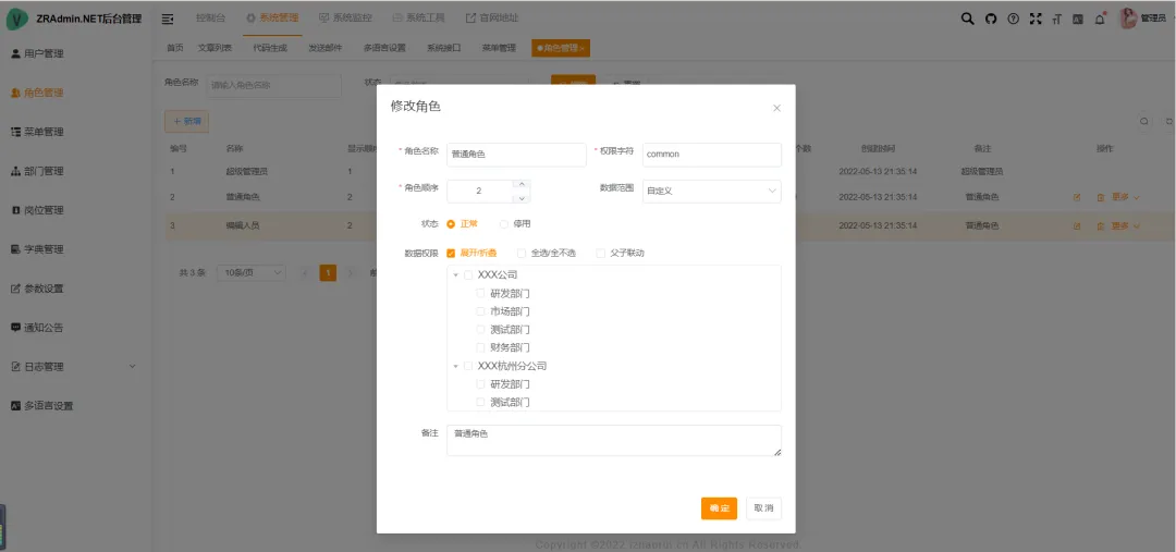 • 角色管理:分配角色菜单权限,支持权限继承与自定义组合。
