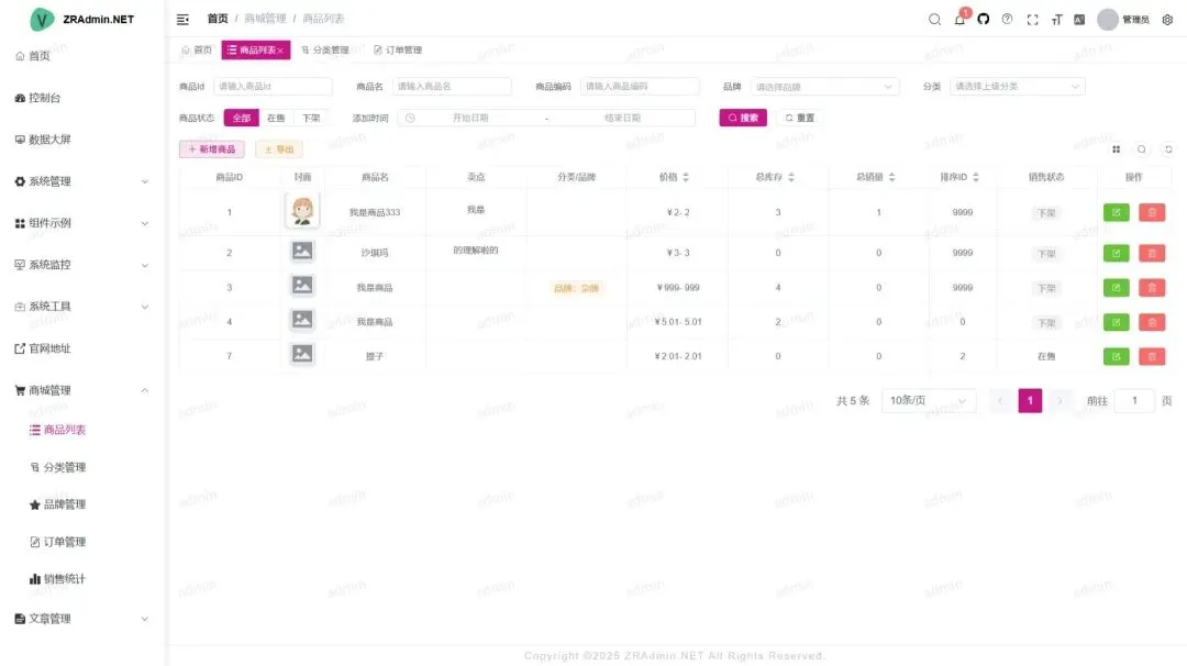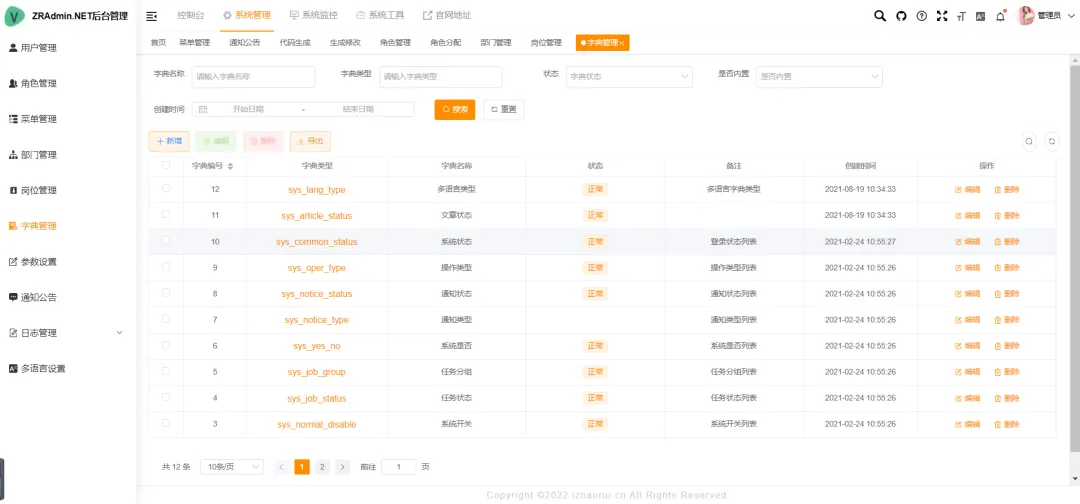 • 字典管理:维护系统中固定常量数据(如状态、类型等),支持动态扩展。