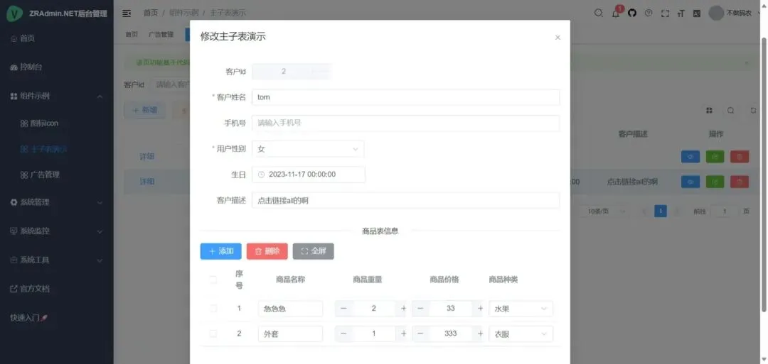 ├─ZR.Service                ->[你的业务服务层类库]:提供自己业务数据Api接口调用;├─ZR.ServiceCore            ->[系统服务层类库]:提供系统Api接口;├─ZR.Repository             ->[仓库层类库]:方便提供有执行存储过程的操作;├─ZR.Model                    ->[实体层类库]:自己业务库表、数据传输对象;├─ZR.Admin.WebApi           ->[webapi接口]:为Vue版或其他三方系统提供接口服务。├─ZR.Tasks                   ->[定时任务类库]:提供项目定时任务实现功能;├─ZR.CodeGenerator          ->[代码生成功能]:包含代码生成的模板、方法、代码生成的下载。├─ZR.Mall                   ->[商城后端]:商城相关的后端代码。├─ZR.Vue                       ->[前端UI]:vue2.0版本UI层(已经不再更新推荐使用vue3)。├─document                   ->[文档]:数据库脚本(已弃用)