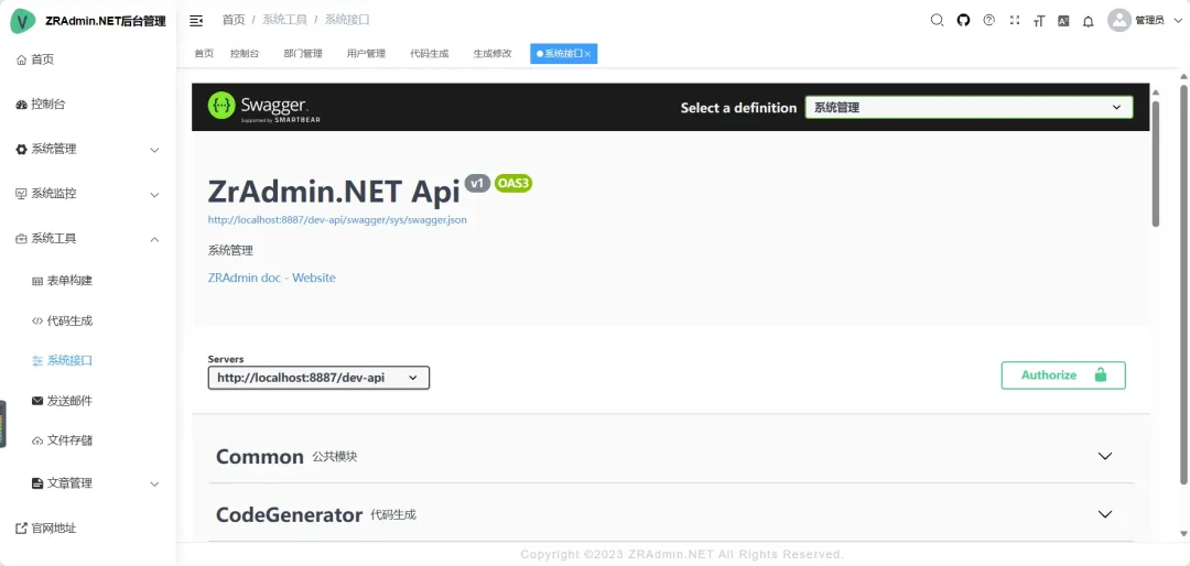 • 打开 ZRAdmin.sln → 设置 ZR.Admin.WebApi 为启动项目 → 运行根目录 startup.bat