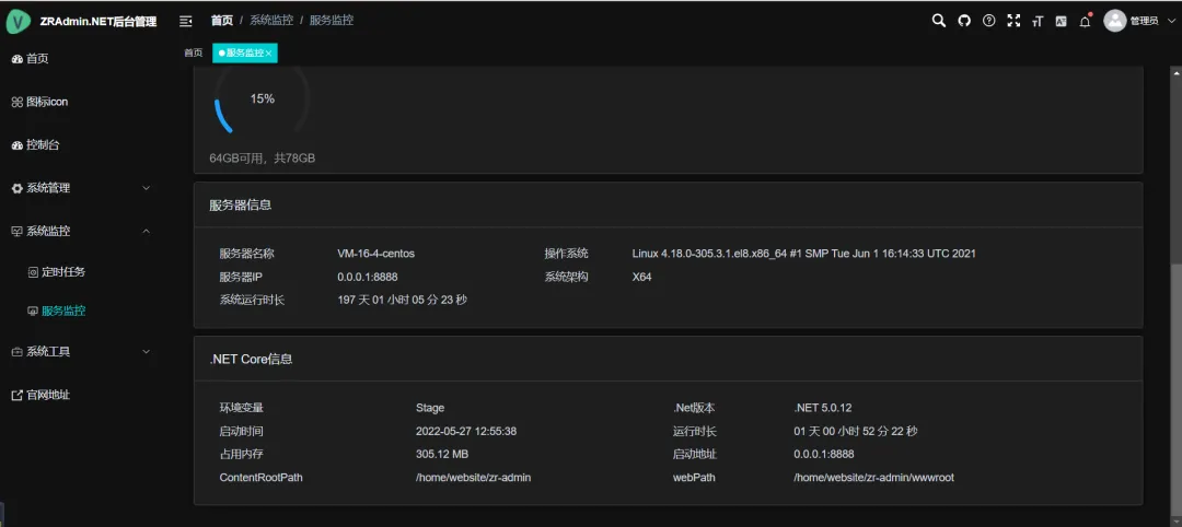 • 服务监控:实时监视系统资源占用(CPU、内存、磁盘、堆栈等)。