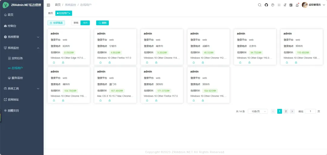 • 在线用户:查看当前登录用户列表,支持强制踢出或发送通知。