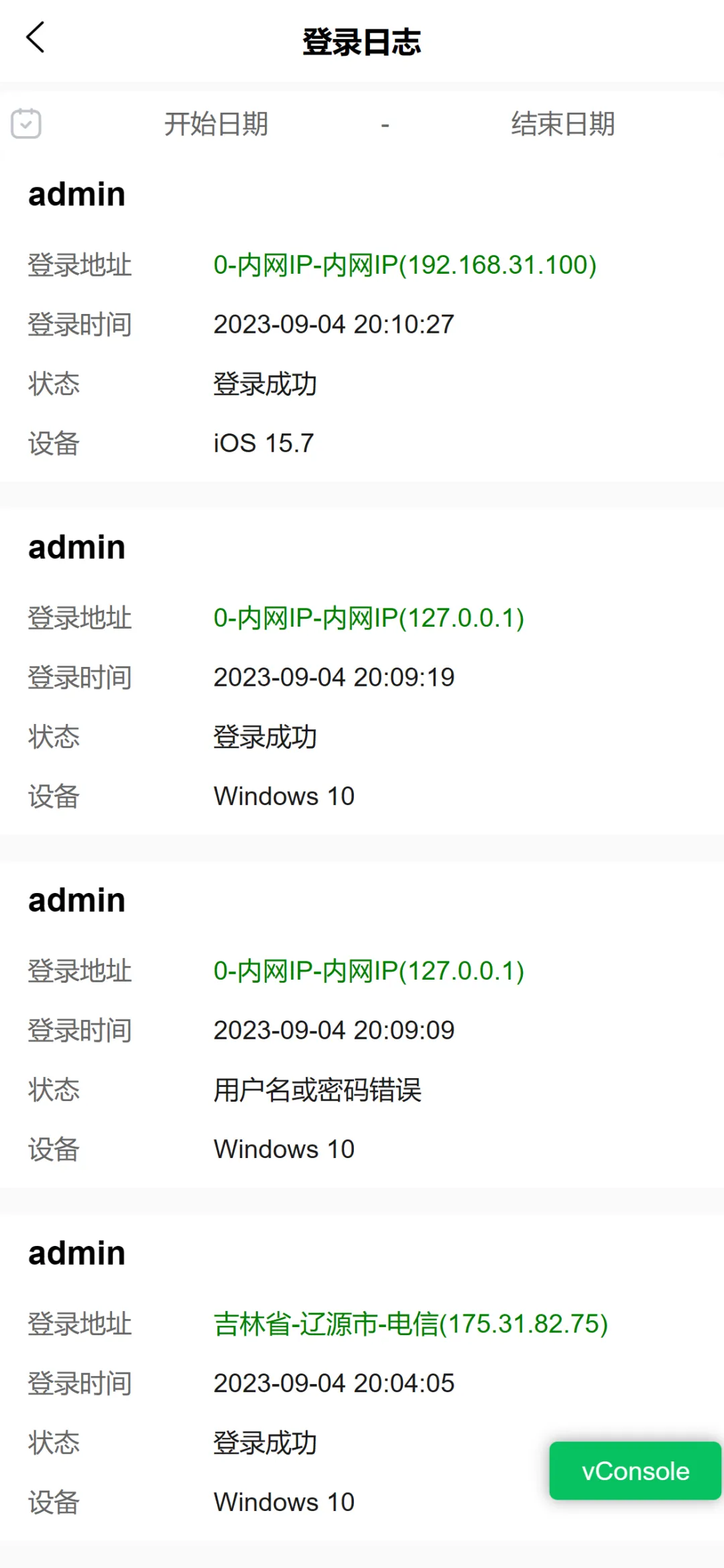 • 操作日志:记录系统正常操作及异常信息,支持按时间、用户等条件查询。